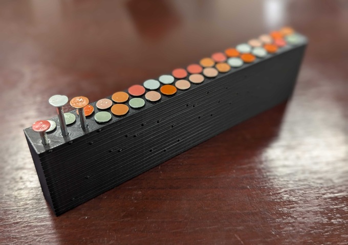 Another puzzle I worked on, the nail polish themed puzzle A Dash of Color, gave puzzlers the interim instruction to come and “get your nails done”. Fully expecting to have a manicure, bartenders instead handed our team a bag full of painted roofing nails of different lengths, along with a 3D printed plastic brick with holes drilled in the top to house the nails.