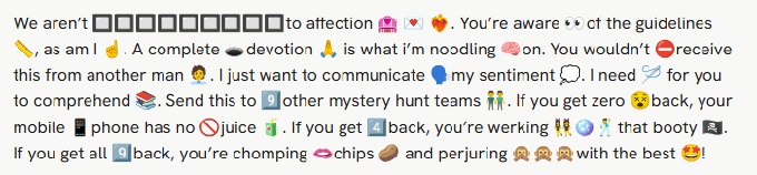 One of the earliest puzzles to unlock for most teams was a “copypasta” puzzle that encouraged puzzlers to spam their friends on other teams. Upon opening the puzzle page, teams would receive one of nine different emoji-laden spam messages. For our team (“Team That is Now Named Later”, or TTINNL, for short), we received the following Rickroll:
