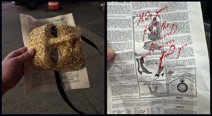 At its core, Masquerade teased the show’s existence with a series of popup experiences, celebrating New York City. As ARGNet previously reported, it started with the immersive show’s historic venue itself: to prepare for the show’s transformation, the windows of Lee’s Art Shop were liberally covered with newspapers. Upon closer inspection, however, many of these papers were referencing the history of Phantom of the Opera in New York City. And scattered in between the real papers from the city were a few in-universe papers about L’Opera Populaire.