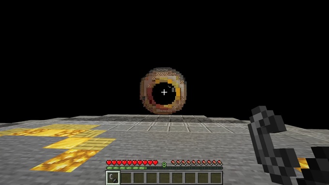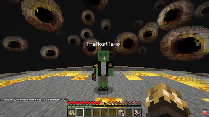 Avery proceeds through many of these elaborately designed worlds and eventually finds the doorway leading to the next, guided by a trail of items. Sometimes, viewers can intuit the way forward themselves. In a world blanketed by a sea of red rolling hills, the landscape is broken up by a series of white houses. Avery focuses on the items inside the houses, missing the giant tiled arrows placed on the floor of each house, directing him where to go. Eventually it’s a crafting table in the distance that leads Avery to his next location. Only this table couldn’t have been placed by D3rlord3, since it appeared out of nowhere. There’s something else leaving a path of breadcrumbs for Avery to follow.